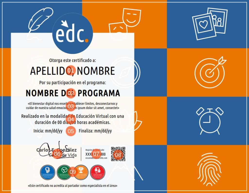- 08: Código QR a través del cual es posible acceder la ficha técnica del programa (Nombre del programa, objetivos, duración y detalles generales del programa)